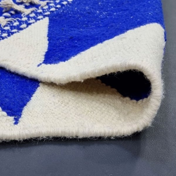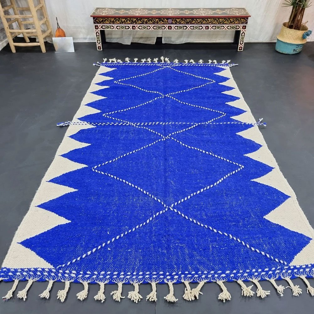 Odmień swój dom dzięki wykwintnemu dywanowi Blue Moroccan Kilim, starannie wykonanemu ręcznie przez rzemieślników Zanafi. Ten wyjątkowy dywan, utkany ze skomplikowanych geometrycznych wzorów, bez wysiłku łączy neutralny i śródziemnomorski styl. Idealny do każdego wnętrza, wnosi ciepło i wyrafinowanie do przestrzeni życiowej, dzięki czemu jest idealnym wyborem zarówno do domów, jak i salonów wystawowych.