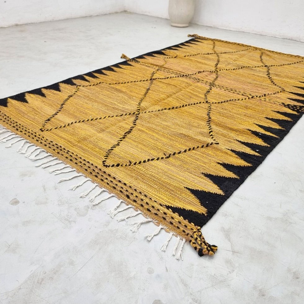 Podnieś swój dom lub salon wystawowy za pomocą tego wykwintnego żółto-czarnego marokańskiego dywanu kilim, ręcznie tkanego przez plemię Zanafi. Każdy egzemplarz jest jedynym w swoim rodzaju arcydziełem, zawierającym skomplikowane geometryczne wzory, które płynnie łączą się ze śródziemnomorską estetyką. Wykonany z oddaniem i miłością, dywan ten obiecuje dodać odrobinę elegancji i autentyczności do każdej przestrzeni.