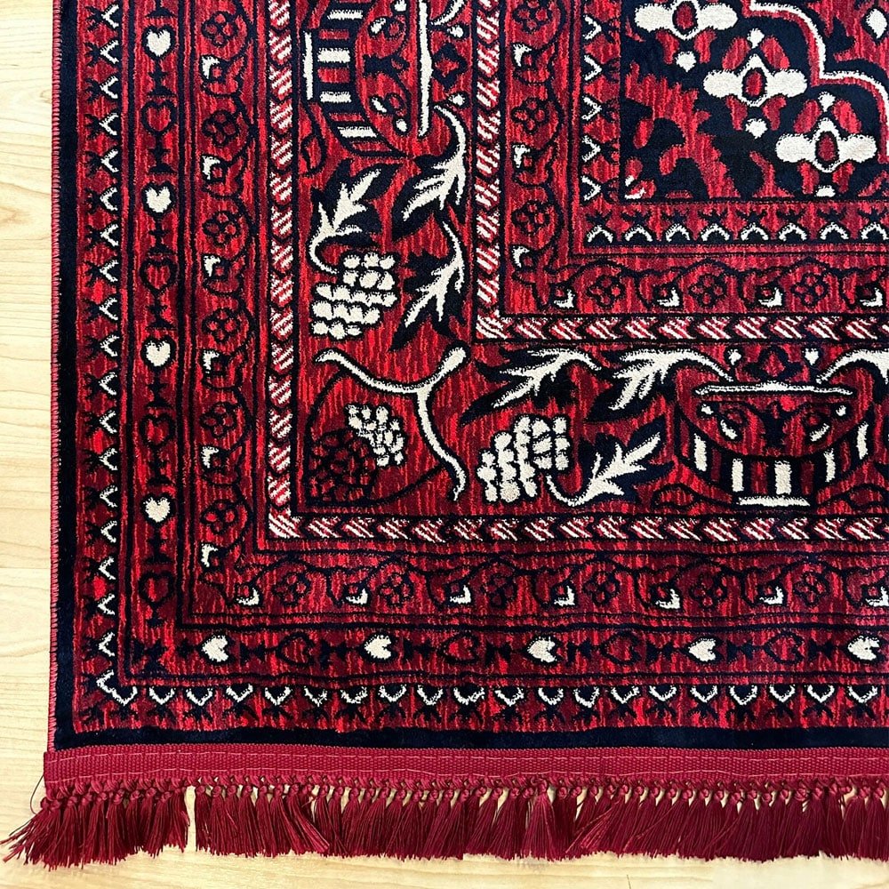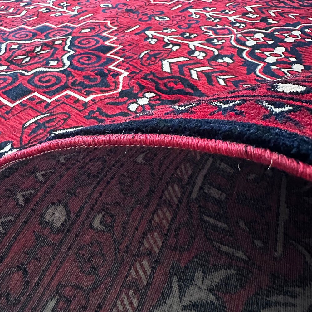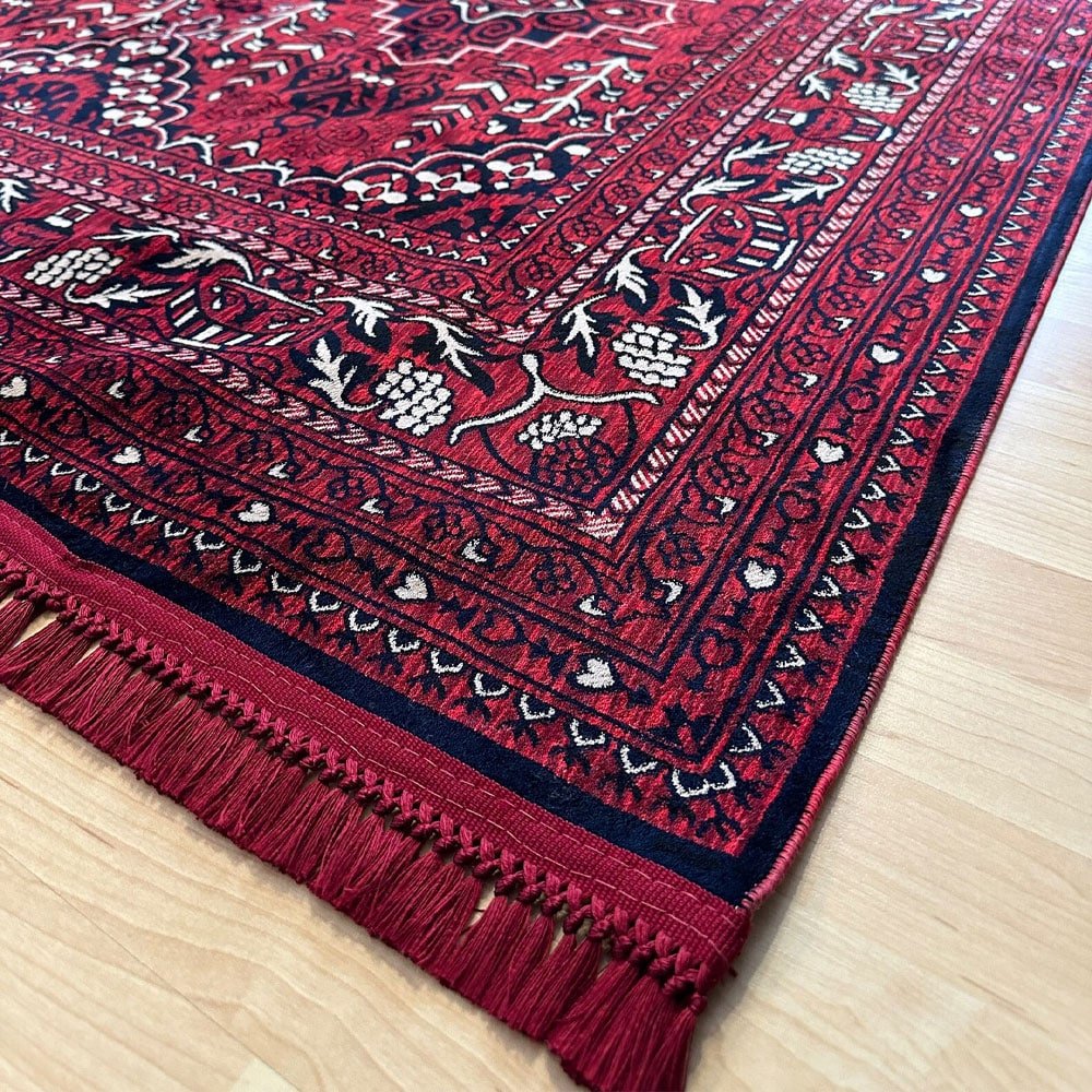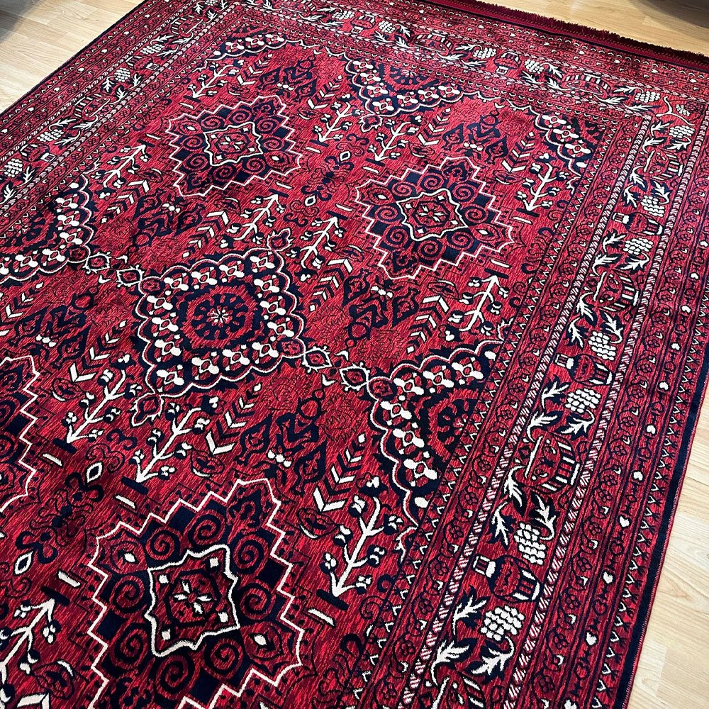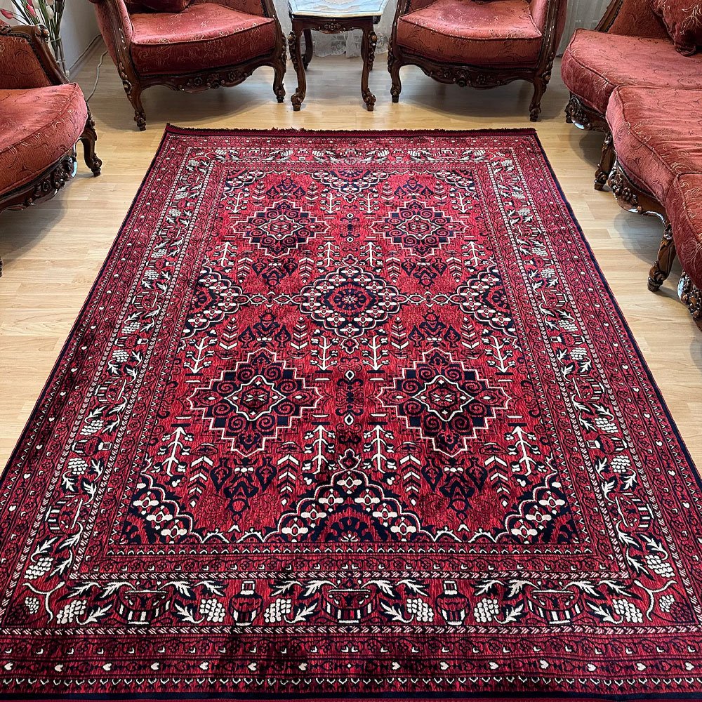 Odmień swoją przestrzeń życiową dzięki temu wyjątkowemu, dużemu, czerwonemu dywanowi w stylu afgańskim, który wniesie do Twojego domu bogaty etniczny urok. Tkany z miękkiej bawełny i szenilu, posiada antypoślizgową podstawę dla większego bezpieczeństwa i można go prać w pralce dla łatwej konserwacji. Idealny do każdego pomieszczenia, jego żywe kolory i skomplikowane anatolijskie motywy zachwycą gości i podniosą wystrój wnętrza.