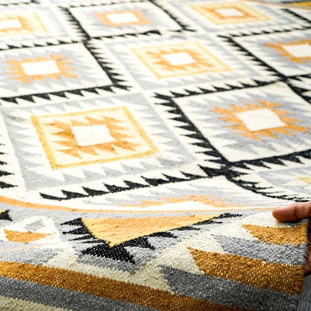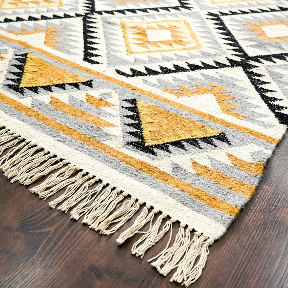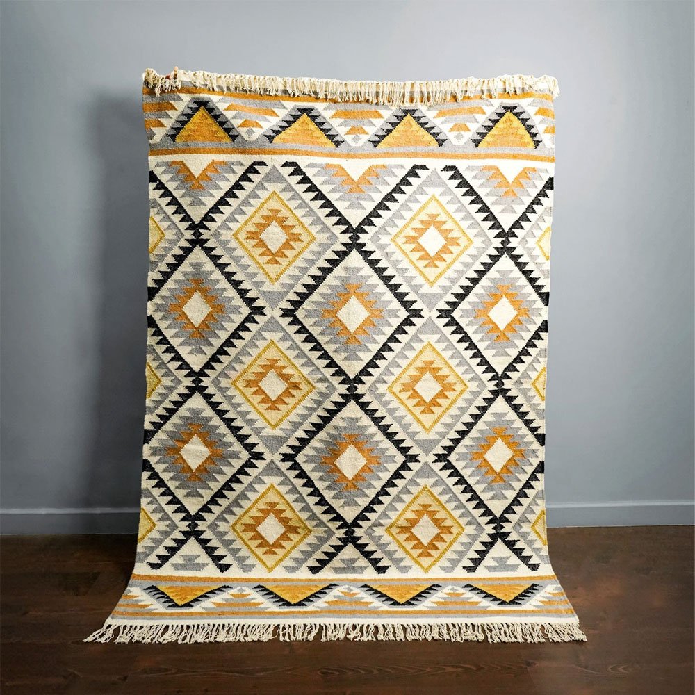 Odmień swój dom dzięki ręcznie tkanemu dywanowi Bright Diamond Indian Kilim, oszałamiającemu połączeniu skandynawskiego minimalizmu i tradycyjnego rzemiosła. Wykonany w 100% z wełny, dywan ten posiada skomplikowane frędzle i plecione warkocze, dzięki czemu jest idealnym elementem centralnym dla obszarów o dużym natężeniu ruchu. Ciesz się ciepłem i teksturą, które wniesie do Twojej przestrzeni życiowej.