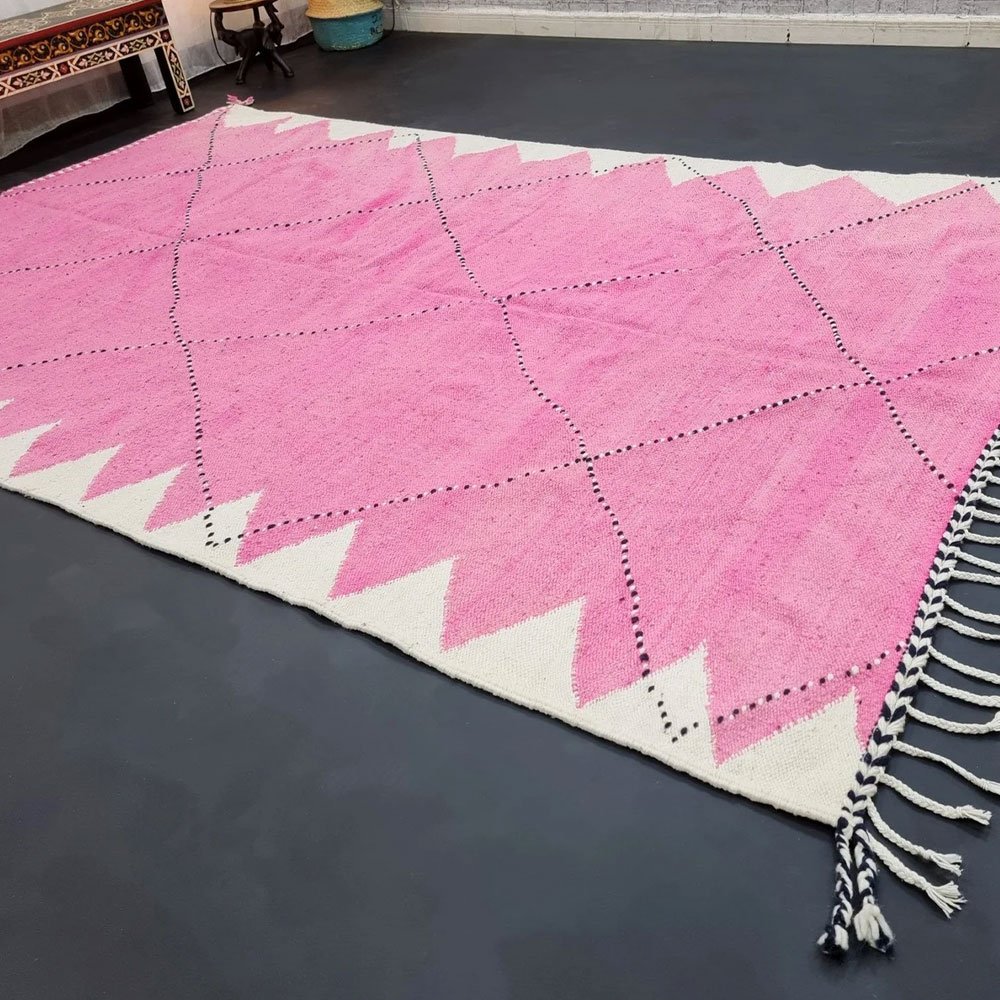 Odmień swój dom dzięki różowemu marokańskiemu dywanowi Kilim, arcydziełu ręcznie tkanemu przez wykwalifikowanych rzemieślników w wiosce Sahara. Każdy dywan Zanafi to unikalna mieszanka skomplikowanych wzorów geometrycznych i naturalnych motywów, oferująca odrobinę śródziemnomorskiej elegancji. Idealny do dodania ciepła i charakteru do każdego pomieszczenia, dywan ten jest wykonany z miłością i precyzją.